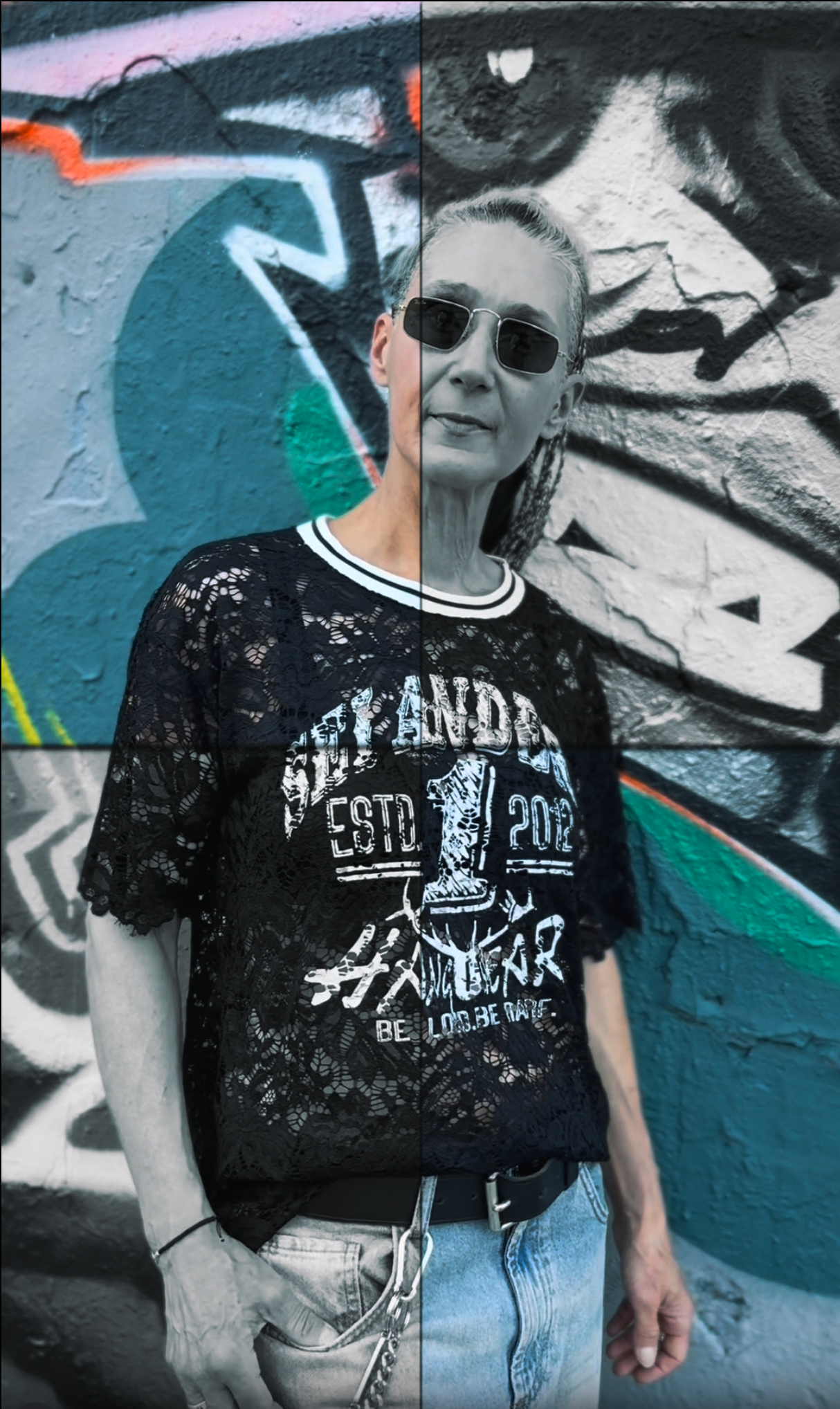Dieses verspielte Oversize-Shirt für Damen kombiniert zarte Spitze mit einem auffälligen Statementdruck im Collagelook auf der Vorderseite. Der lockere Schnitt sorgt für Komfort und einen lässigen Style, der jedem Outfit eine kreative Note verleiht. Perfekt, um mit einem Augenzwinkern deinen individuellen Look zu unterstreichen.